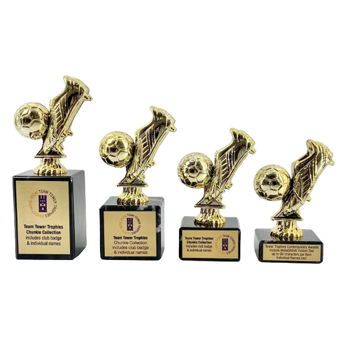 The Chunkie Football Boot & Ball Trophy is a sports trophy designed to recognise and celebrate your football achievement. This product is presented in mirror finish gold set on to a real marble base and is available in 4 sizes, with the tallest being 170mm. It is part of the exclusive Tower Trophies Chunkie Collection and brings together a great value football trophy with the all important heavyweight 'clunk' factor. Perfect as a Football Squad Trophy or as a Man of the Match Trophy.
