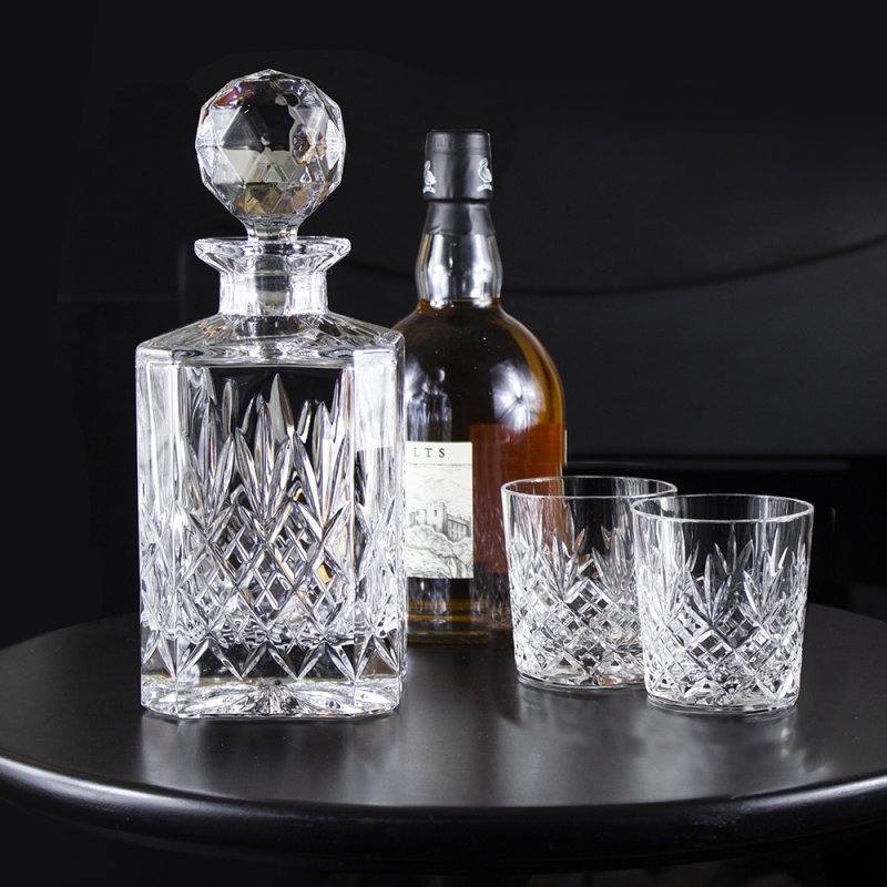 Edinburgh Crystal Whisky Set- Square Spirit Decanter & 2 Whisky Tumblers | Personalised Box