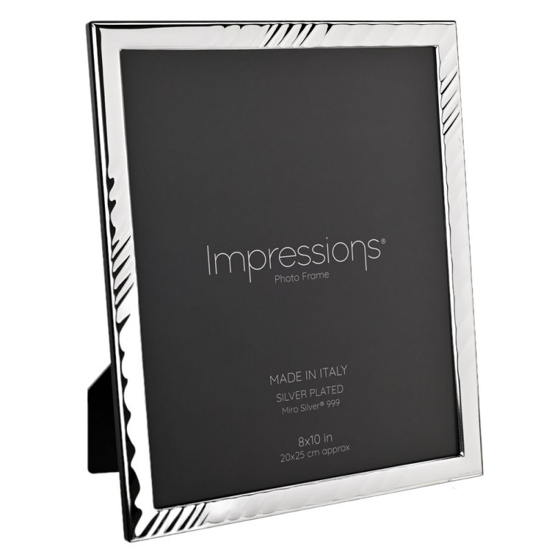Showcase favourite moments with the Impressions 999 Silver Textured Wave Photo Frame 8” x 10”, with a wood back and made in Italy. Featuring a textured wave design and a sleek shiny finish, this frame adds depth and visual interest to photos. It's a stylish accent piece that enhances home decor with a touch of contemporary flair. Lidded box packaging.