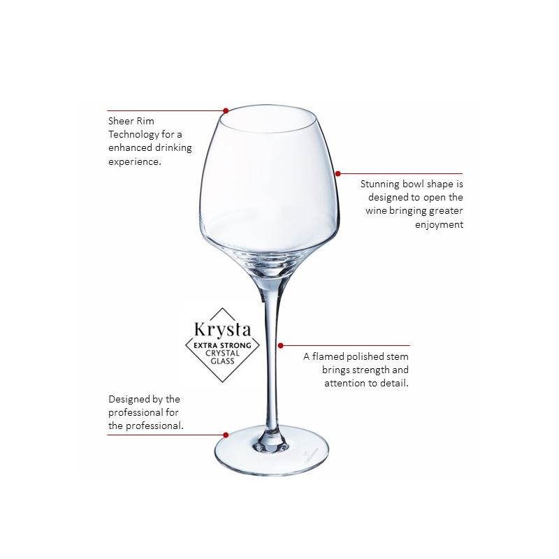 The iconic shape of the Open Up range creates an accelerated decanter effect that encourages aromas to develop. The large surface for oxygenation, that closed wines require, in the lower bowl helps the aromas develop, whilst the upper part of the glass concentrates the aroma, these elements all come together to allow instant enjoyment.
